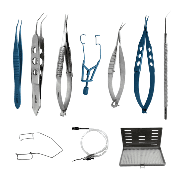 Our ophthalmic instrument sets are carefully curated for specific surgical procedures, ensuring efficiency, consistency, and readiness in operating theatre environments. Commonly supplied sets include those designed for cataract surgery, phacoemulsification, glaucoma procedures, squint correction, and DCR surgeries, among several other specialised ophthalmic procedures, each assembled to support smooth surgical workflow and reliable performance.